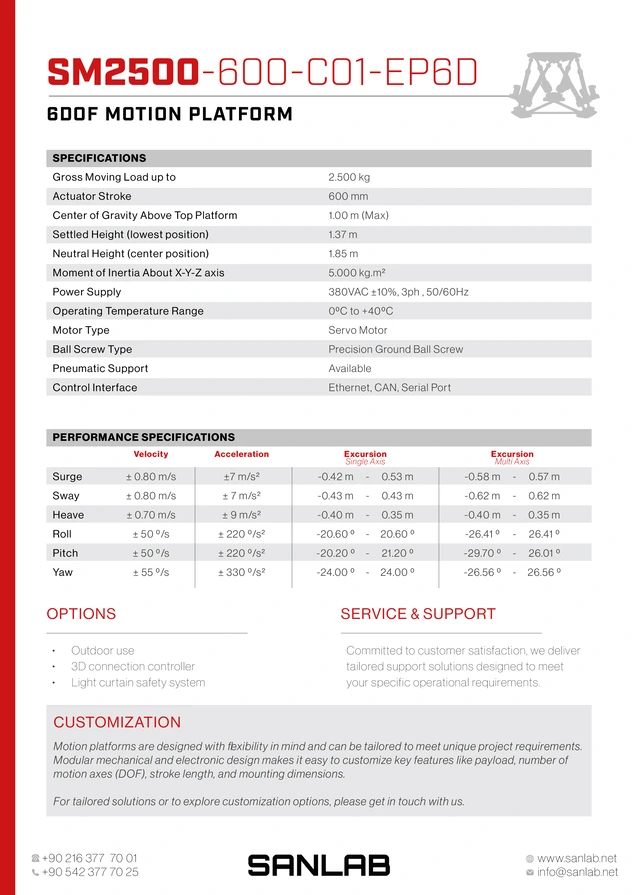 SMotion2500 is a reinforced 6DOF motion platform with 2500 kg payload, built for simulation, heavy testing, and industrial use. Its stable control and strong build suit full-size cabins and defense setups.