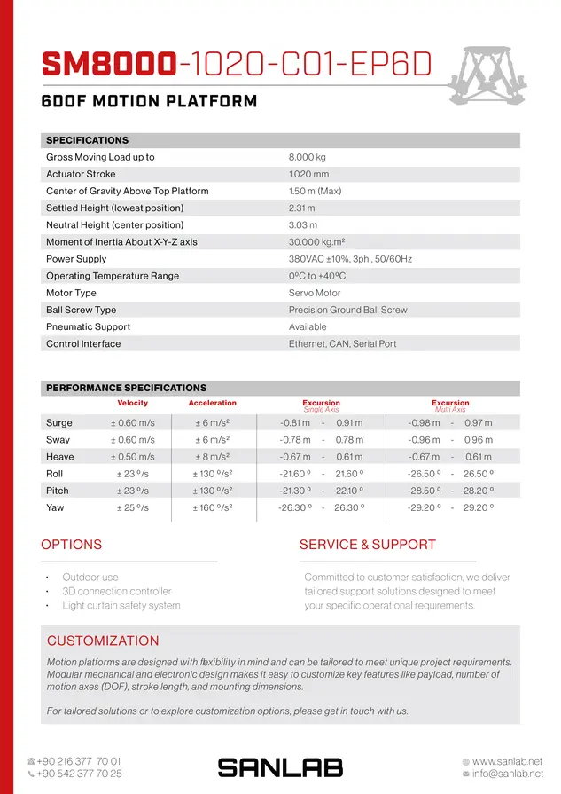 SMotion8000 is a state-of-the-art 6DOF (Six Degrees of Freedom) motion platform designed to provide precise movement and control for various high-tech applications. It boasts a payload capacity of 8000 kilograms, making it a versatile solution for a range of industries.
